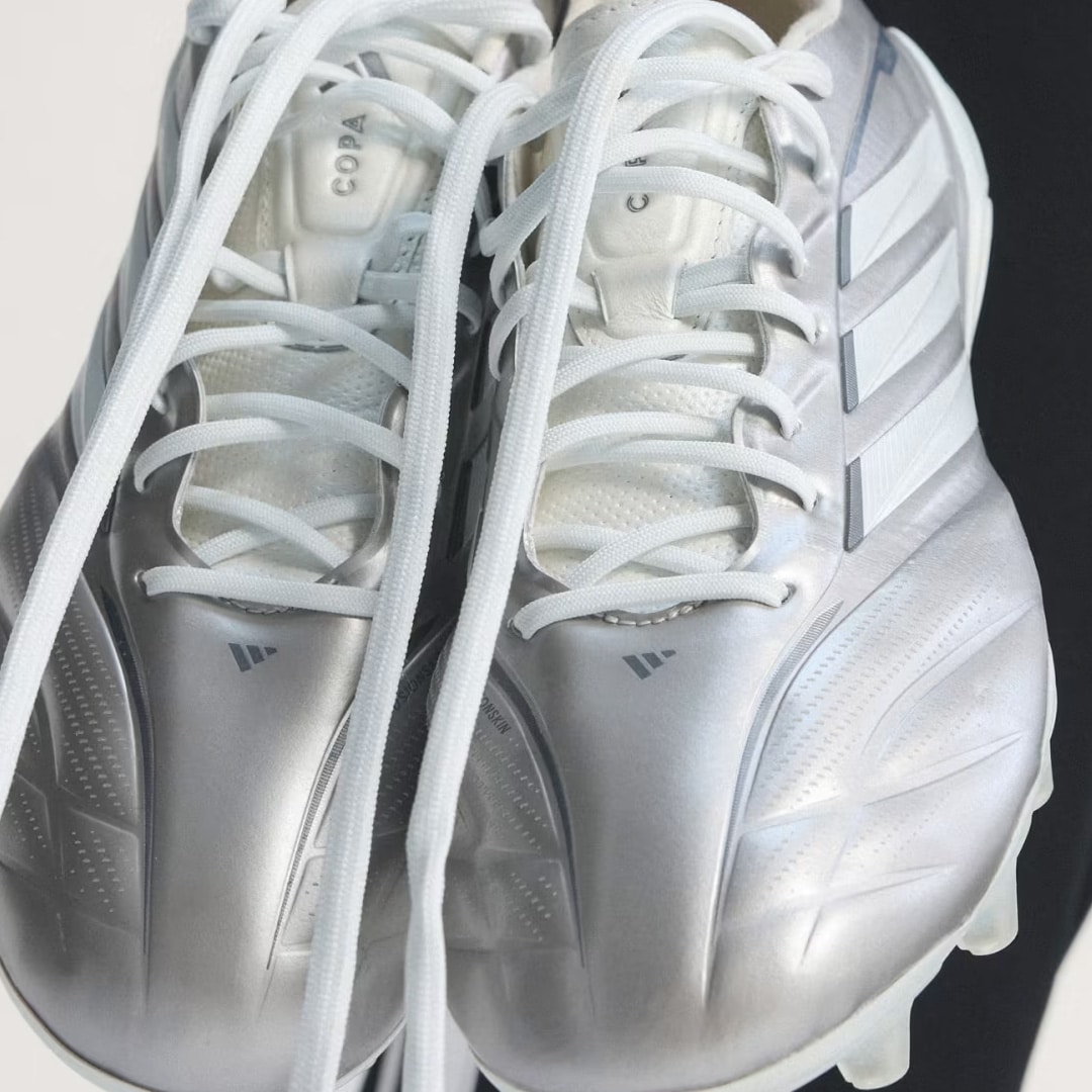The pack leaned heavily into icy tones and frozen aesthetics, with each silo carrying its own interpretation of the concept of cold precision. The F50 arrived in a striking electric blue base, sliced open by vivid solar yellow Three Stripes that felt sharp and aggressive. In contrast, the Adidas Predator shifted into a lighter, almost frozen-sky palette. Its Crystal Sky upper blended pale icy blue with deeper blue and neon yellow accents, creating a layered visual. Then there’s the Adidas Copa Pure, which takes a more refined route as it draped in a soft metallic silver. It delivered a clean, almost liquid sheen, going for a minimalist but premium look.