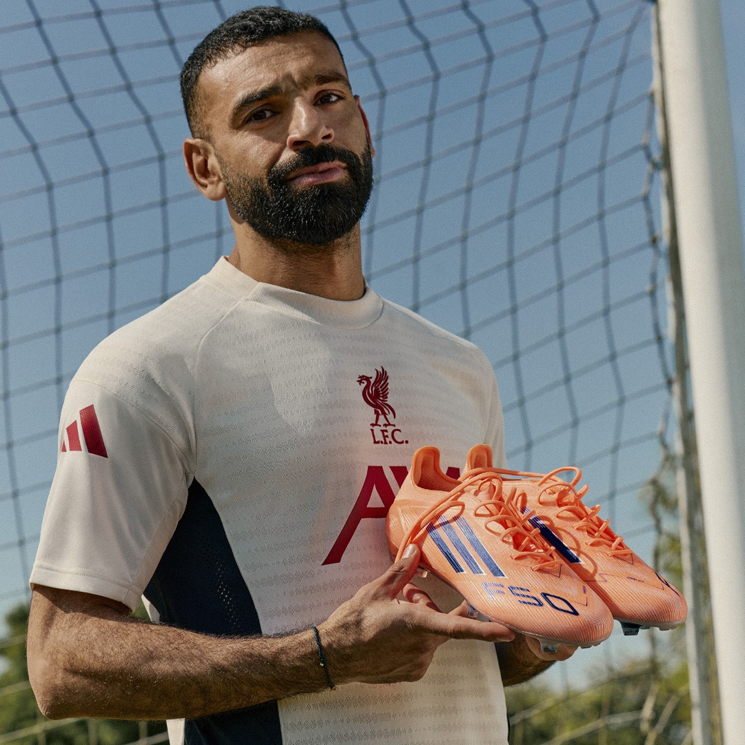 Already a shoe-in for the Golden Boot award and the league title, Salah wore a special one-off adidas F50 for the last match of the 2024/25 season. The Liverbird was central to the design of the boots, with the bespoke graphics featuring prominently on the sides of each boot in the shade of adidas teal. On the lateral side of the boot, the graphics blur into a bright, solar green at the ankle to provoke a sense of speed and agility-key attributes in the winger’s style of play. With the Stripes finish in metallic gold, the boots reflected Salah’s status as a serial winner, both on individual and team level.